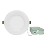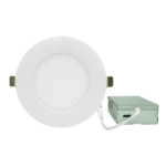 The EDF Fire-Rated Downlights are code-compliant for use in fire-rated constructions for up to 2 hours. They offer multiple CCT options (2700K, 3000K, 3500K, 4000K, and 5000K) for flexible lighting needs. The downlights feature a steel housing for durability and fire resistance, with edge-lit technology for a slim fixture profile. The optical system ensures uniform light distribution, utilizing high-performance LEDs with a 90+ CRI and an R9 > 60. Electrical specifications include 120VAC input voltage and an operating temperature range of -40°F to 113°F. The fixtures are dimmable to 5% with TRIAC dimmers. They feature a white powder coat finish with a red powder coat on the backside for fire resistance. Installation is simplified with spring-loaded retention tabs, remote driver/junction box, and quick connectors.